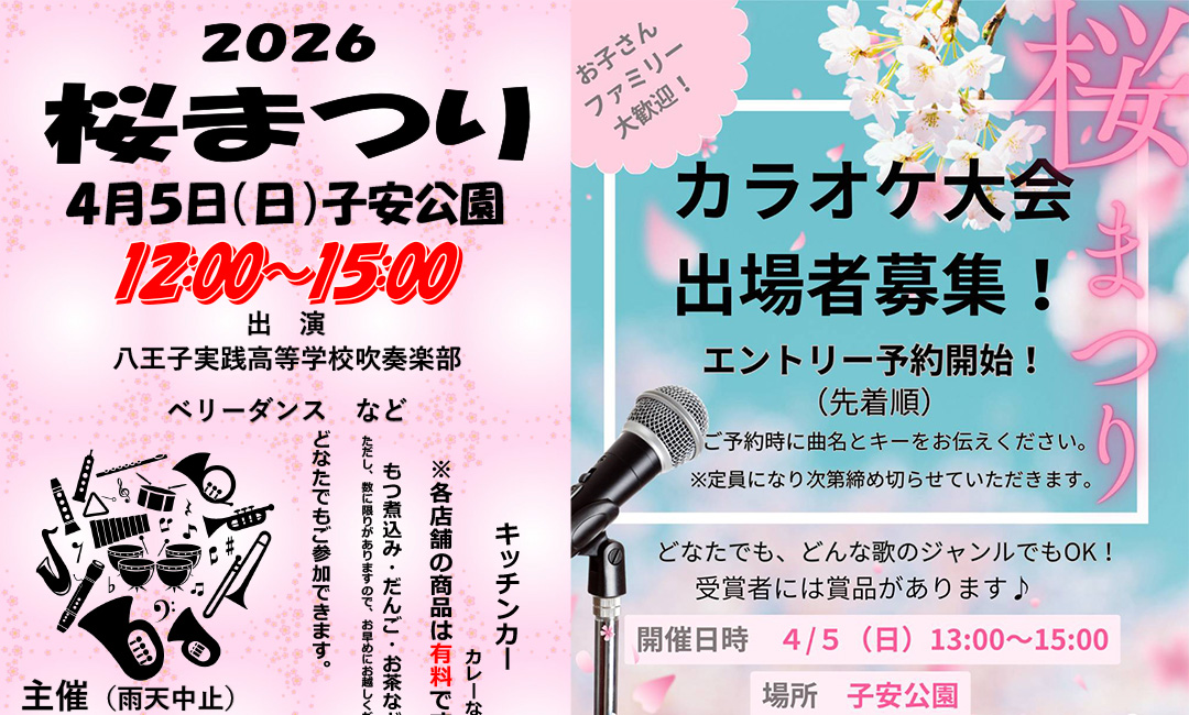 4月5日(日)、子安公園で行われる「2026年桜まつり」に出展しPRをさせていただきます。お祭りでは、高校吹奏楽部の演奏やベリーダンスのステージもあり、様々な催し物も用意しているようです。13時〜はカラオケ大会も行われます。ぜひ遊びにきてください♪