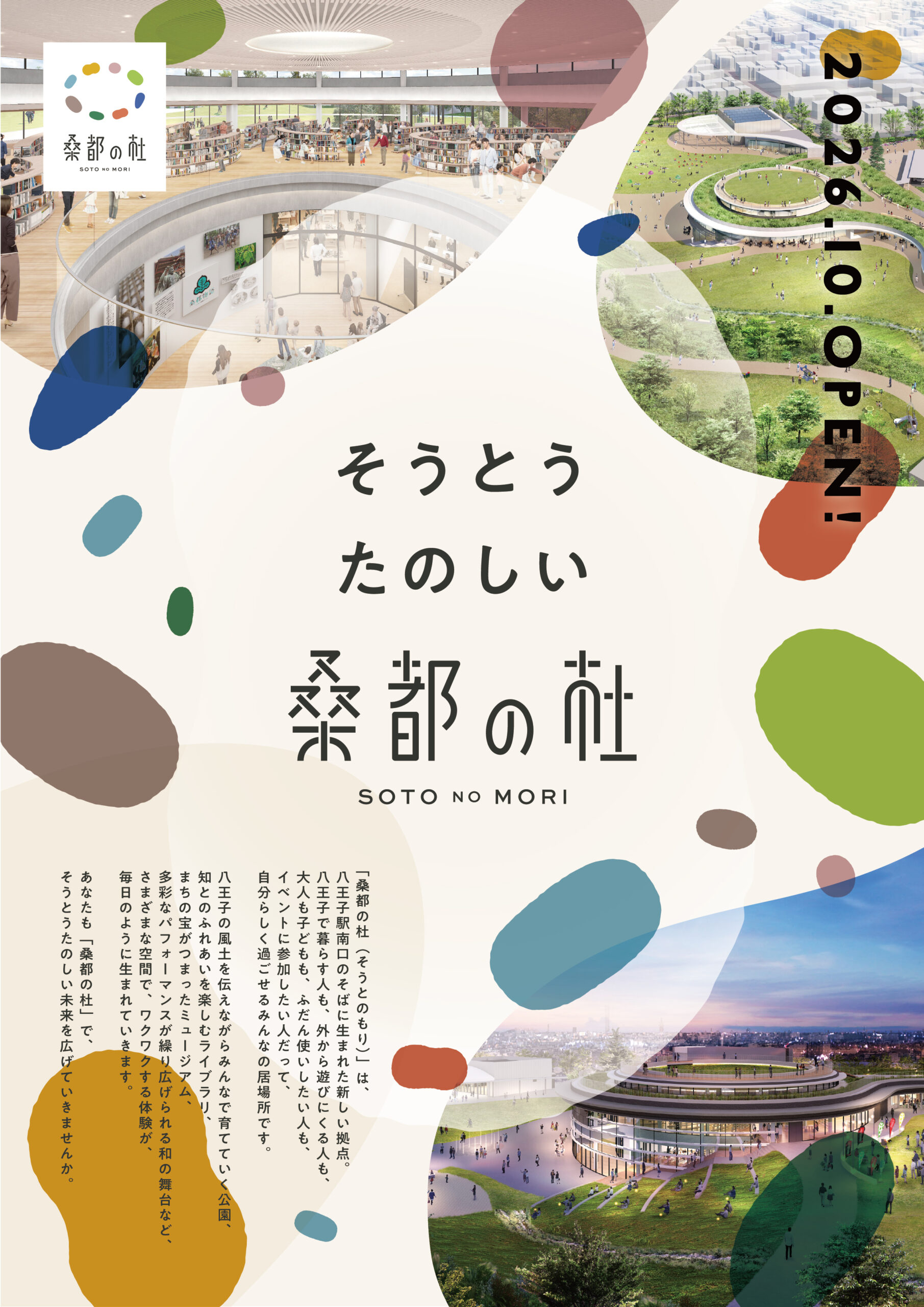 合言葉(ブランドメッセージ)「そうとう たのしい 桑都の杜」は、昨年5月に行われた市民共創ワークショップに参加いただいたみなさんの言葉や想いをもとに、これからの桑都の杜を表す言葉として制作しました。八王子の魅力に触れながら、さまざまな空間でわくわくと過ごし、誰もが自分らしくいられる心地よい居場所となるよう願いを込めています。